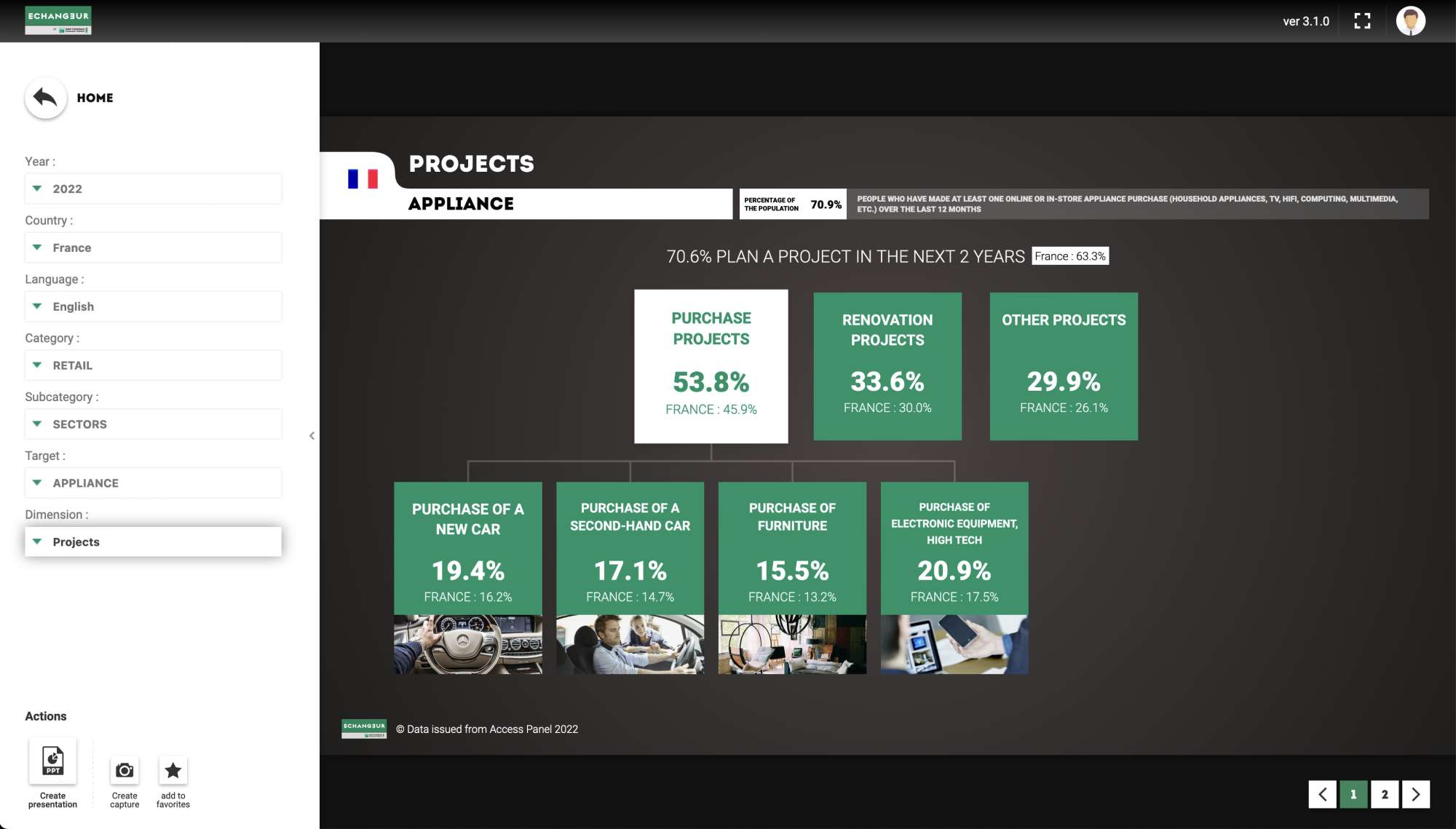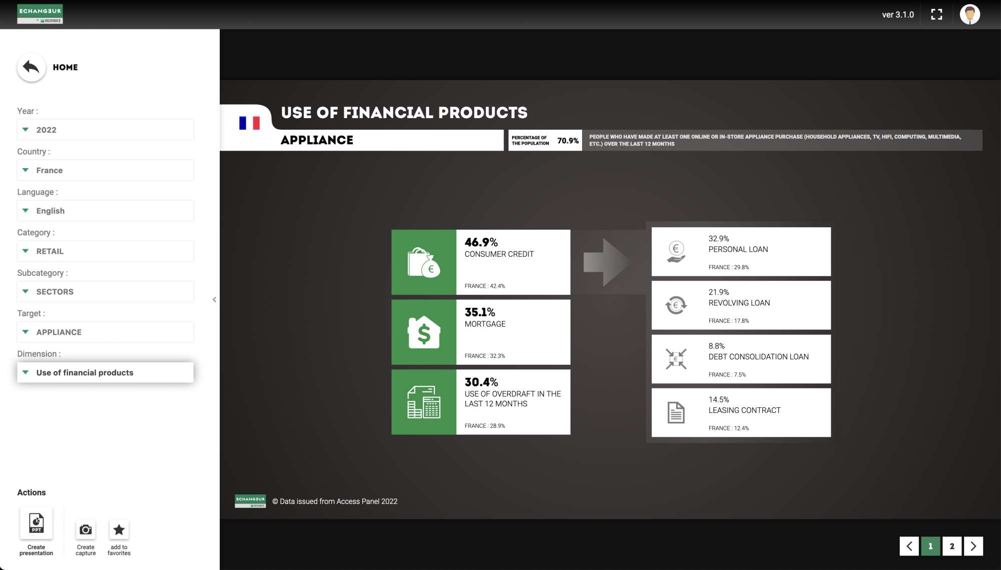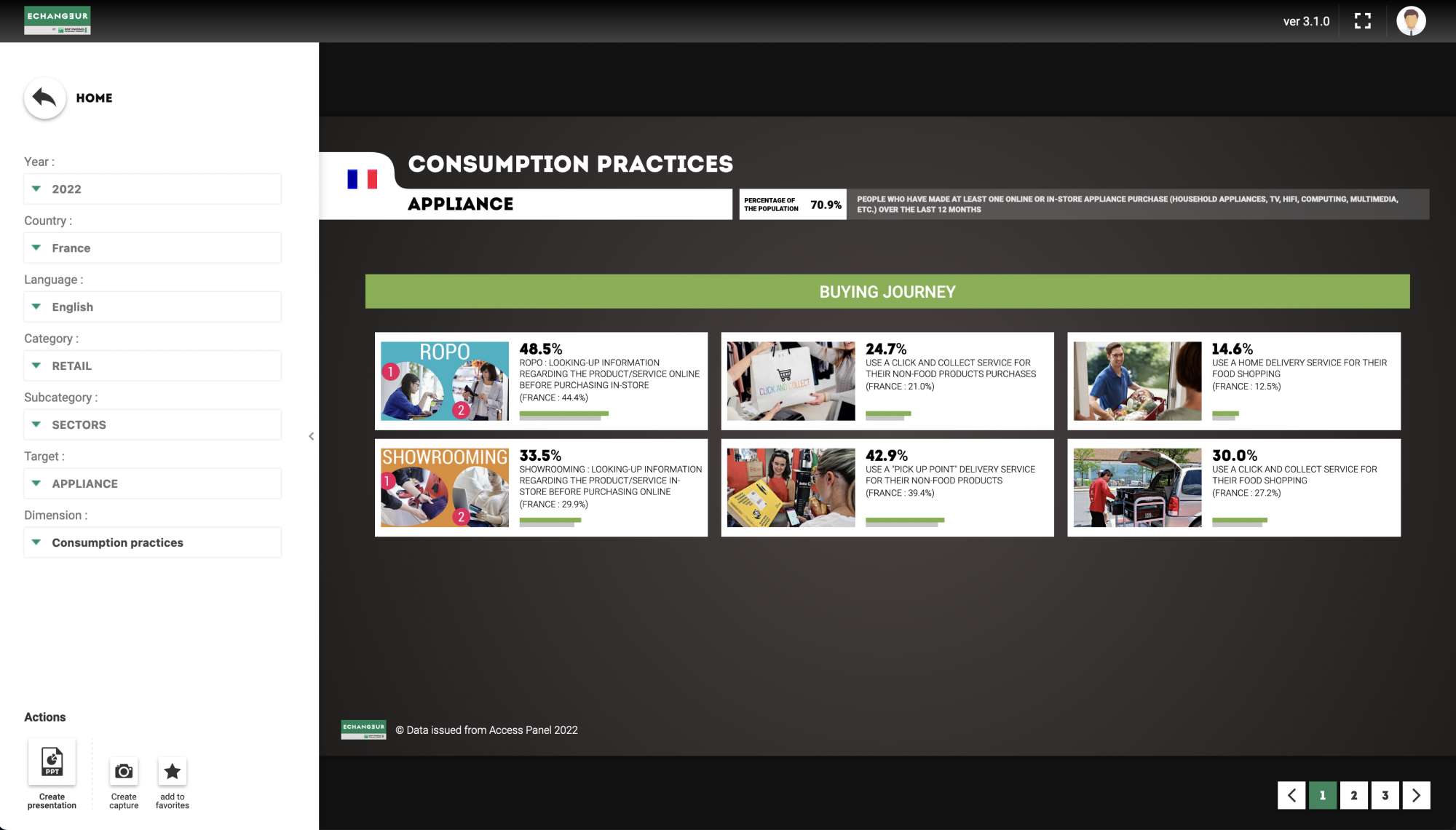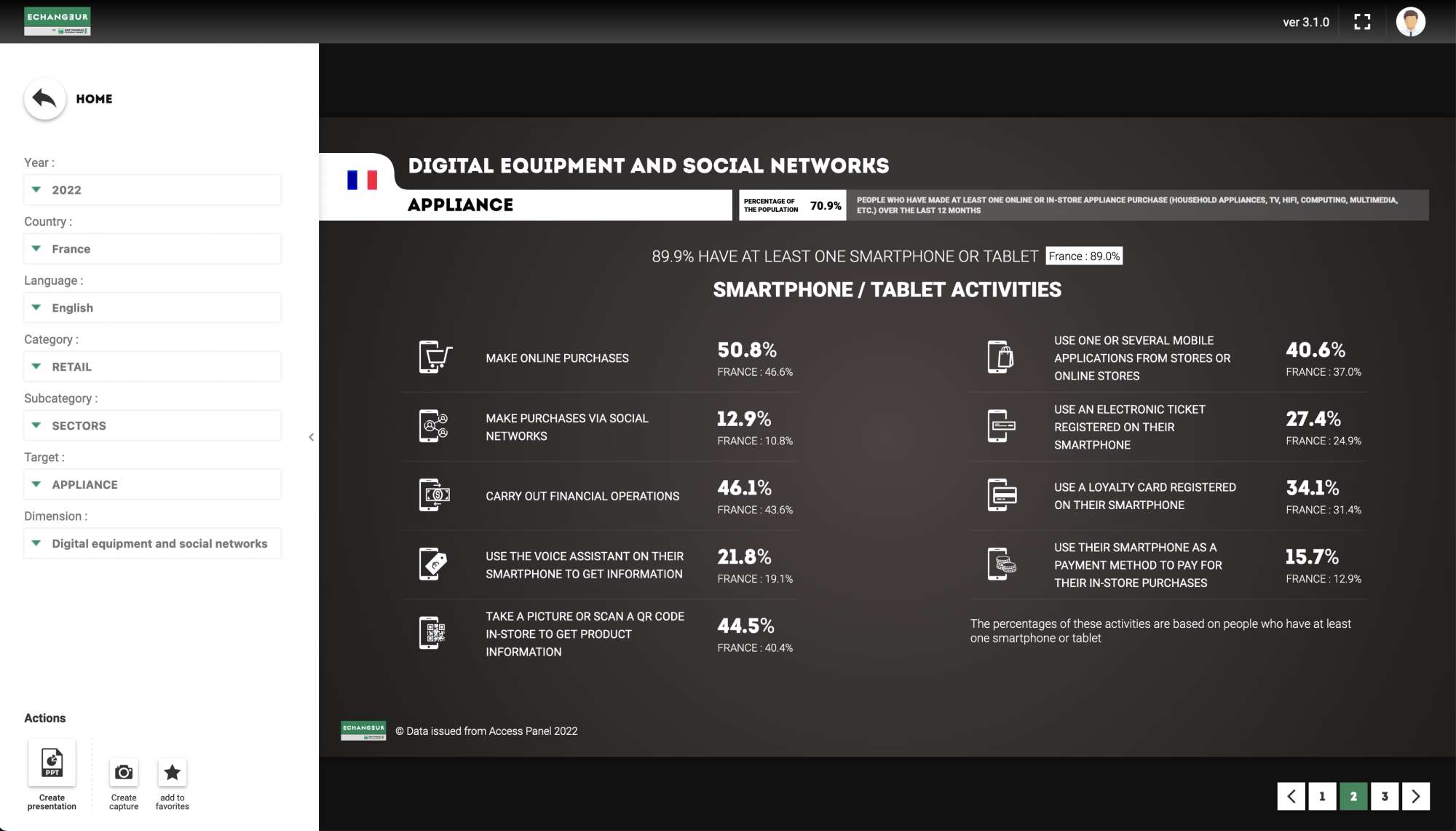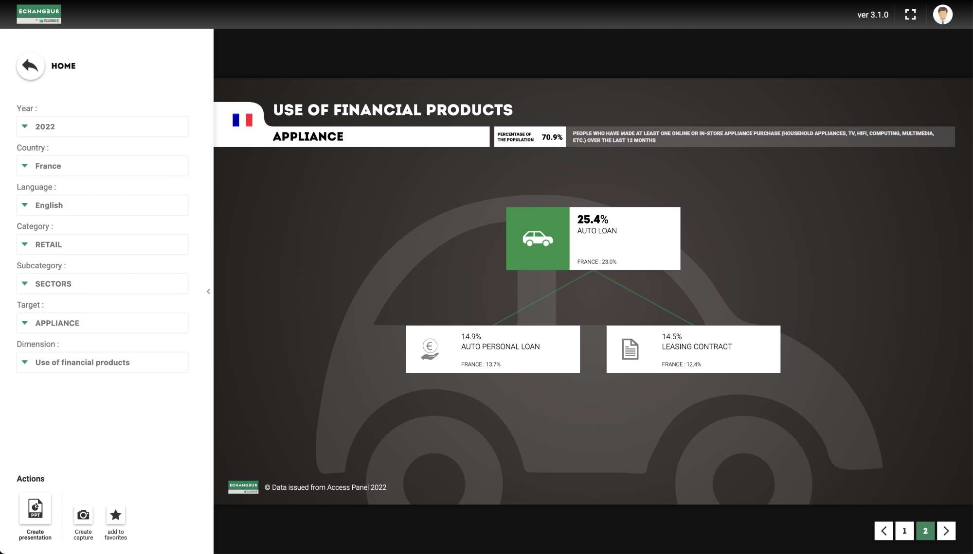 Extension synchronisée du showroom Echangeur, à portée de l’ensemble des unités pays de la BNP. La technologie adapte l’environnement de datavisualisation au standard HTML et permet la consultation administrée de l’ensemble des données de d’analyse de l’Access Panel.