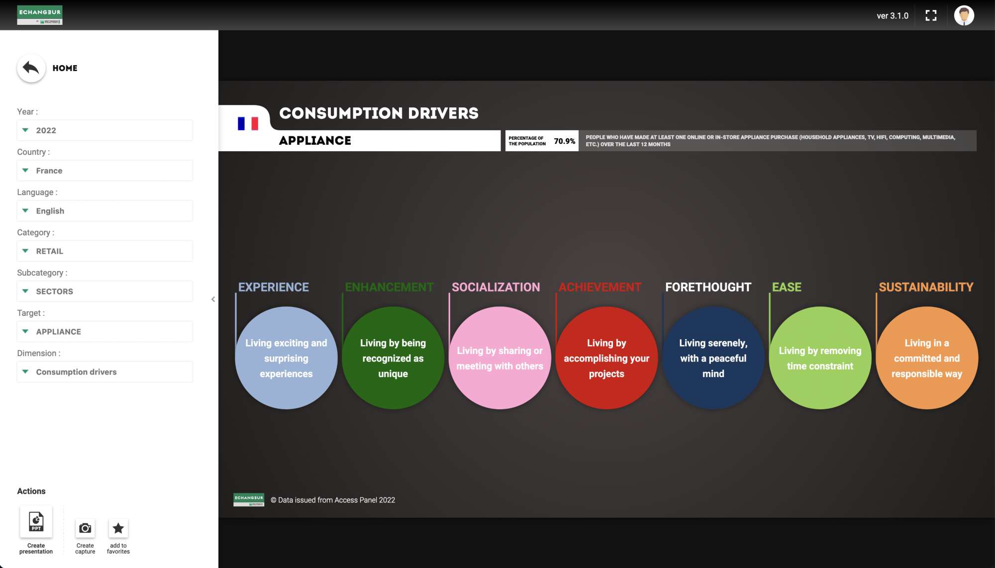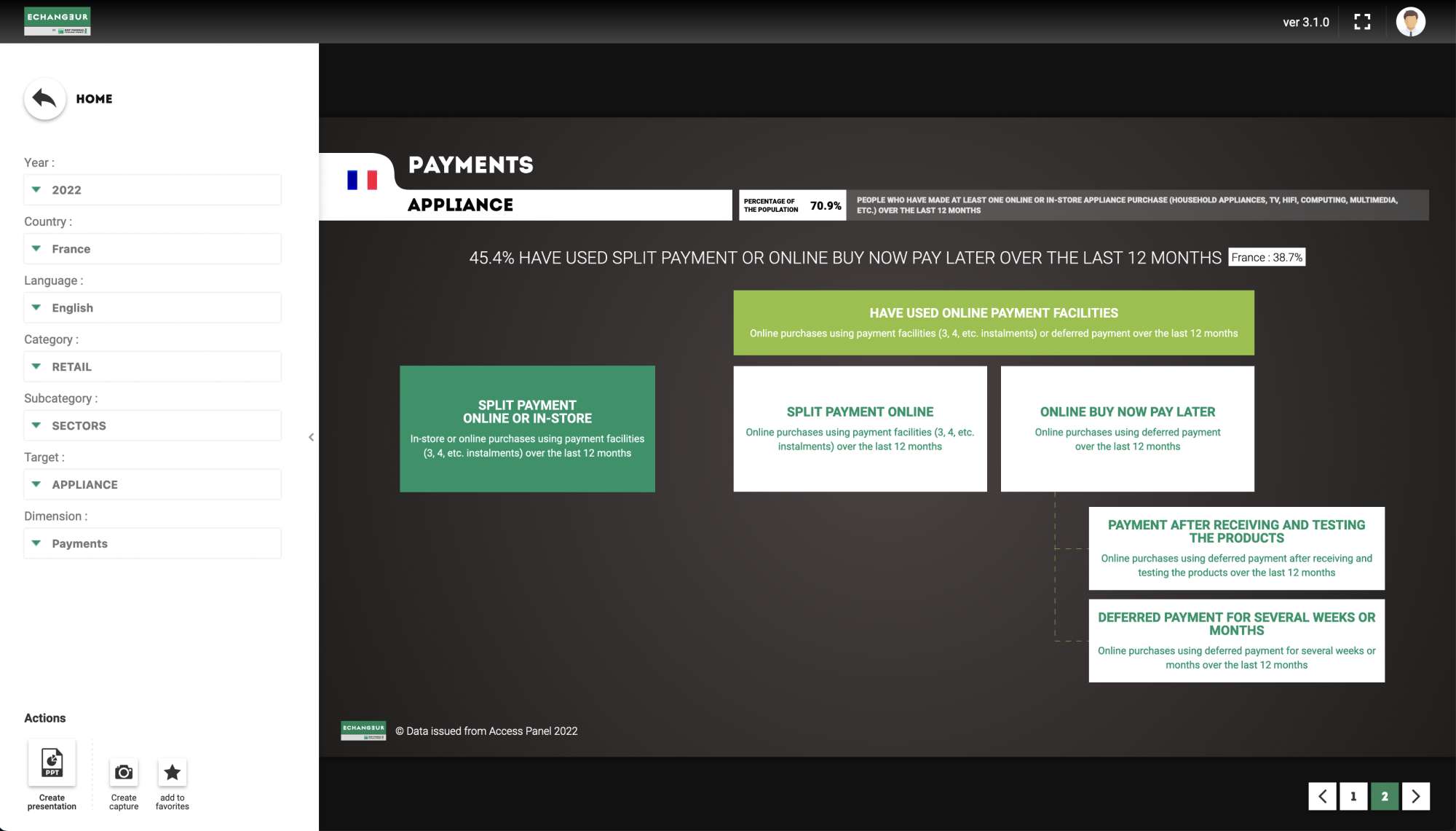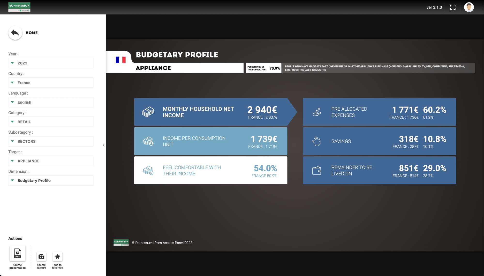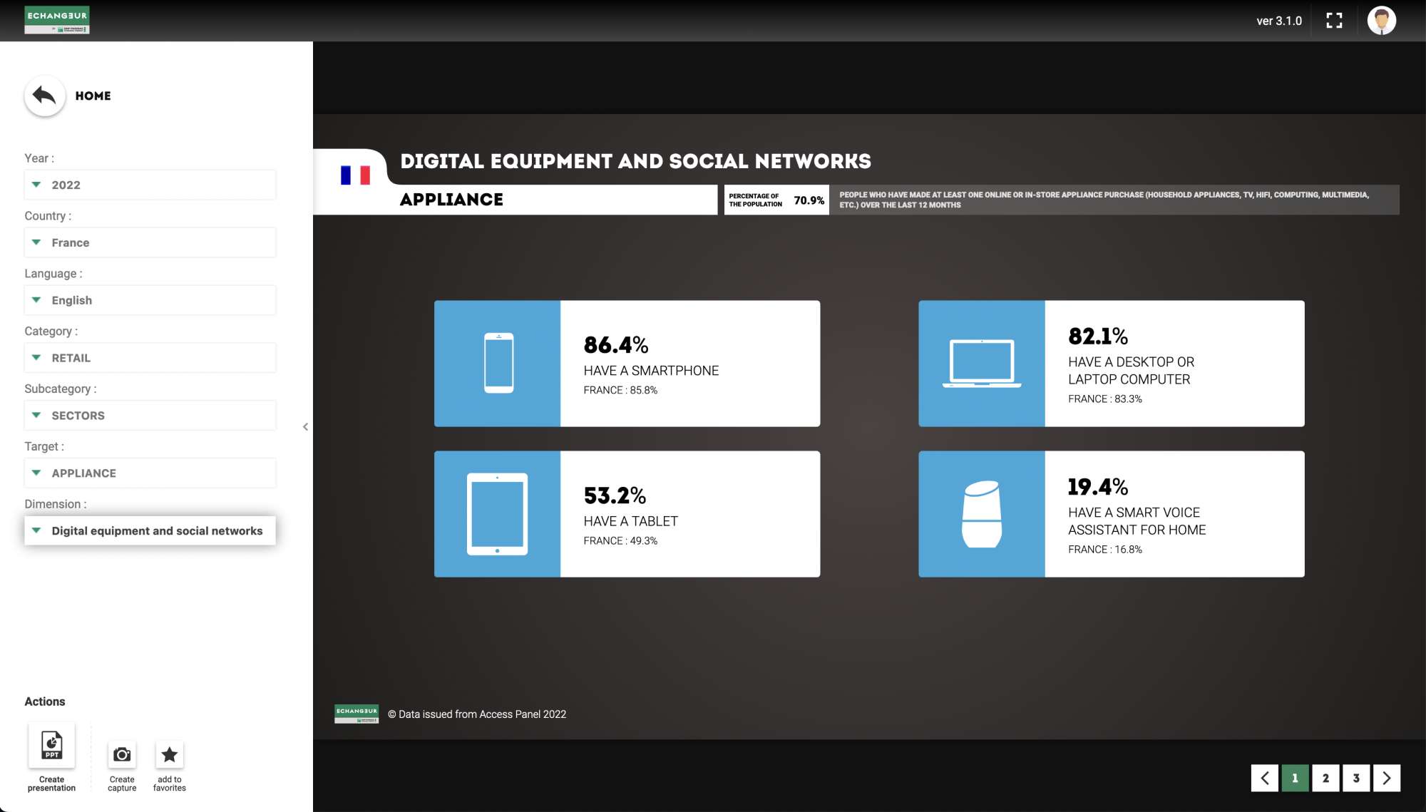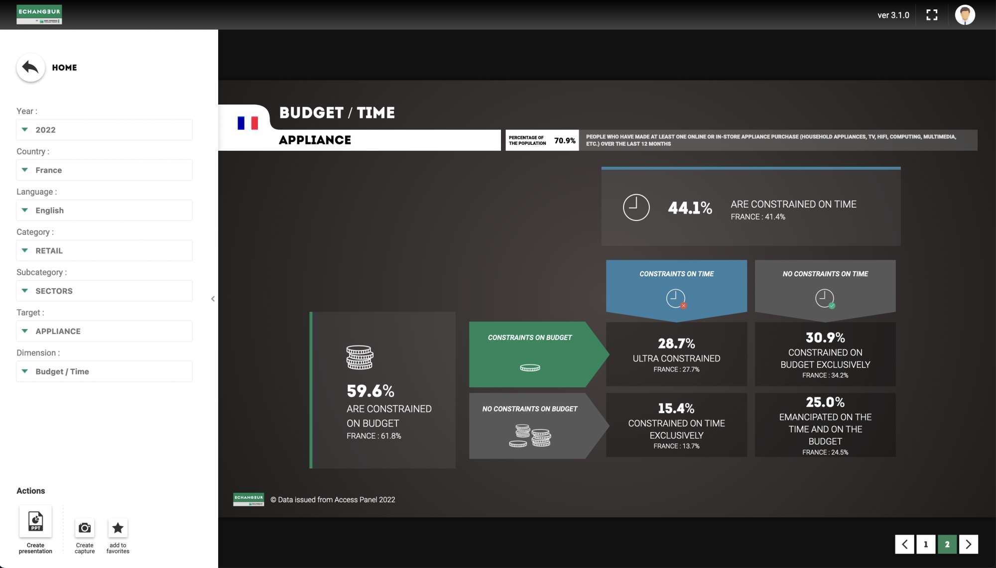 Extension synchronisée du showroom Echangeur, à portée de l’ensemble des unités pays de la BNP. La technologie adapte l’environnement de datavisualisation au standard HTML et permet la consultation administrée de l’ensemble des données de d’analyse de l’Access Panel.