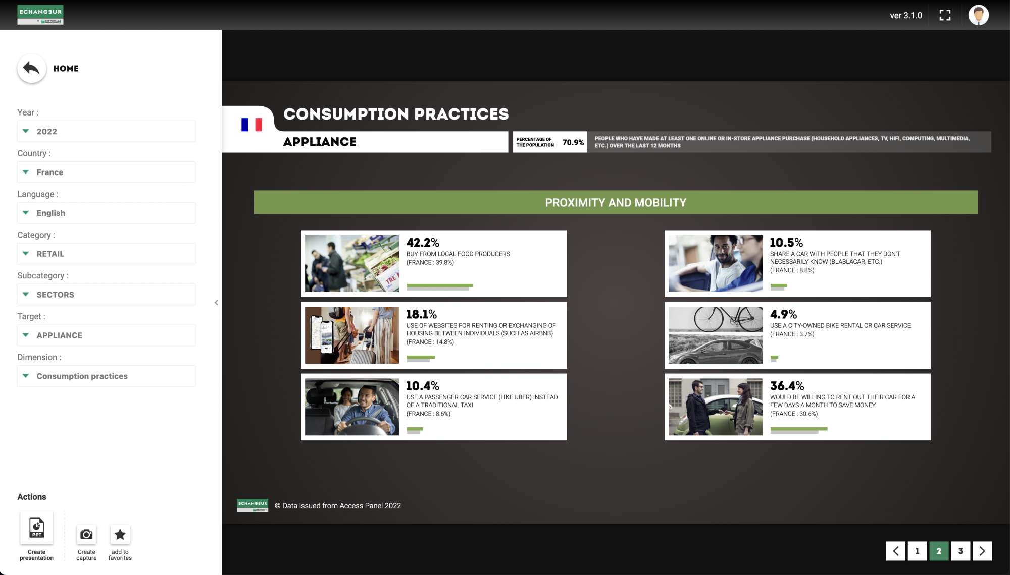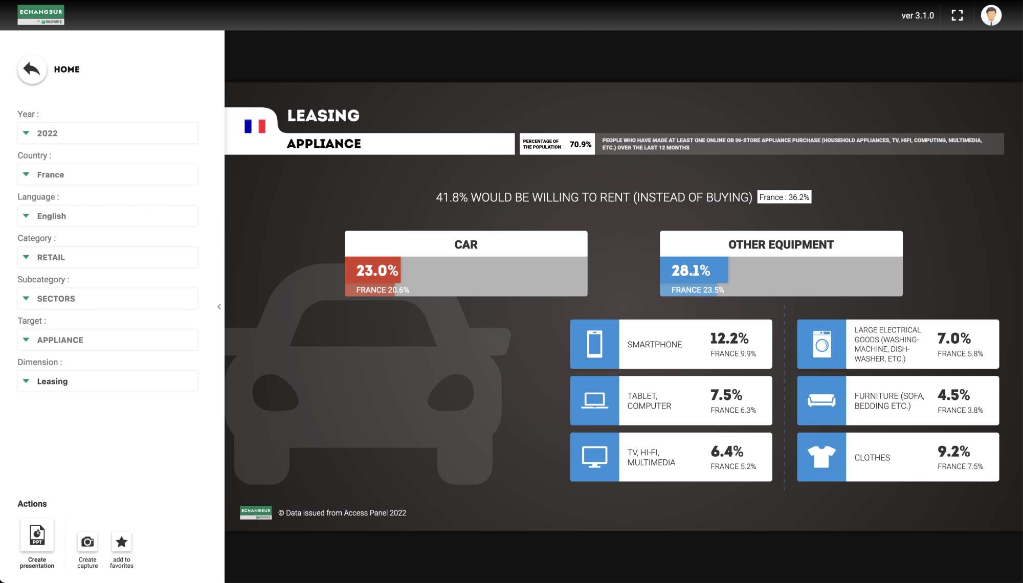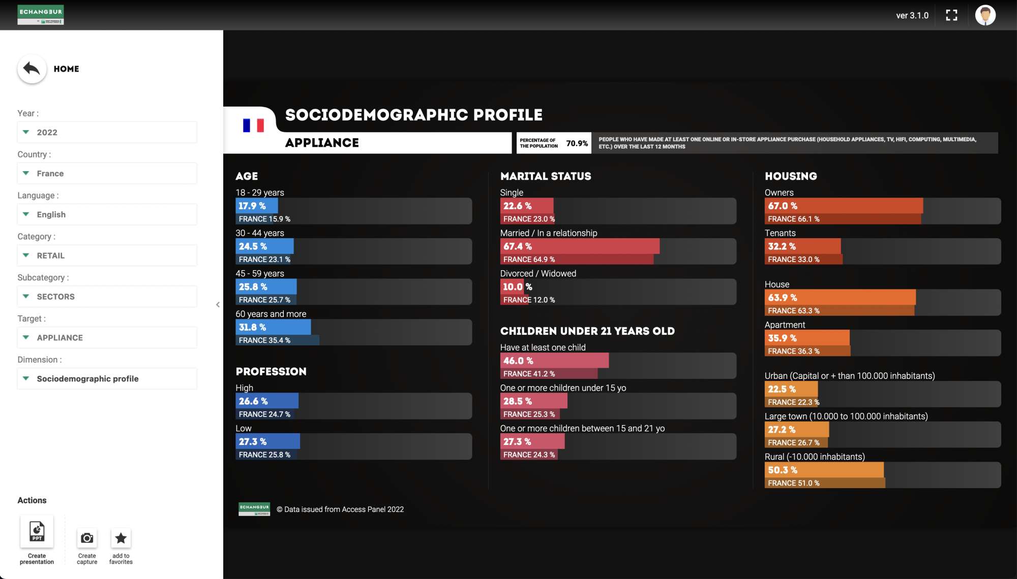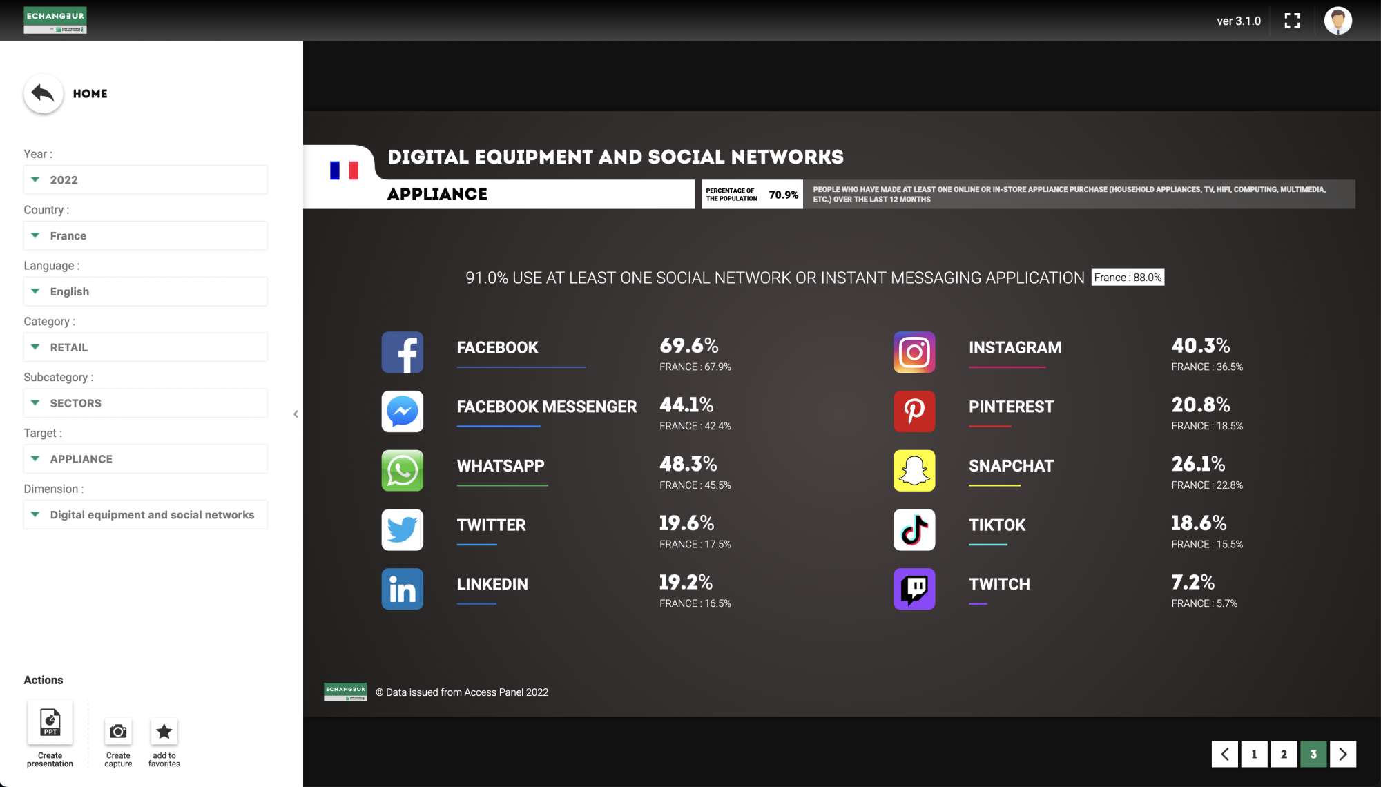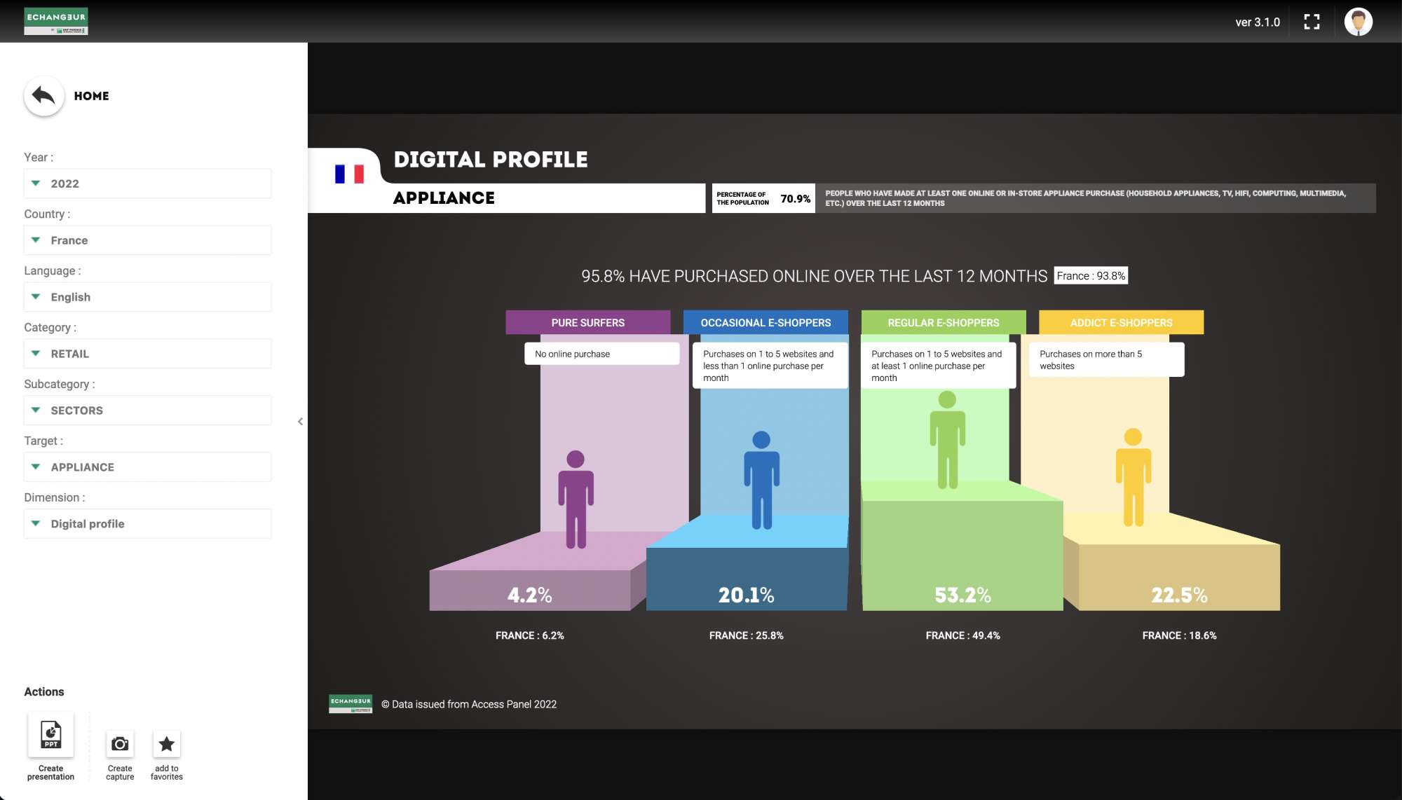 Extension synchronisée du showroom Echangeur, à portée de l’ensemble des unités pays de la BNP. La technologie adapte l’environnement de datavisualisation au standard HTML et permet la consultation administrée de l’ensemble des données de d’analyse de l’Access Panel.