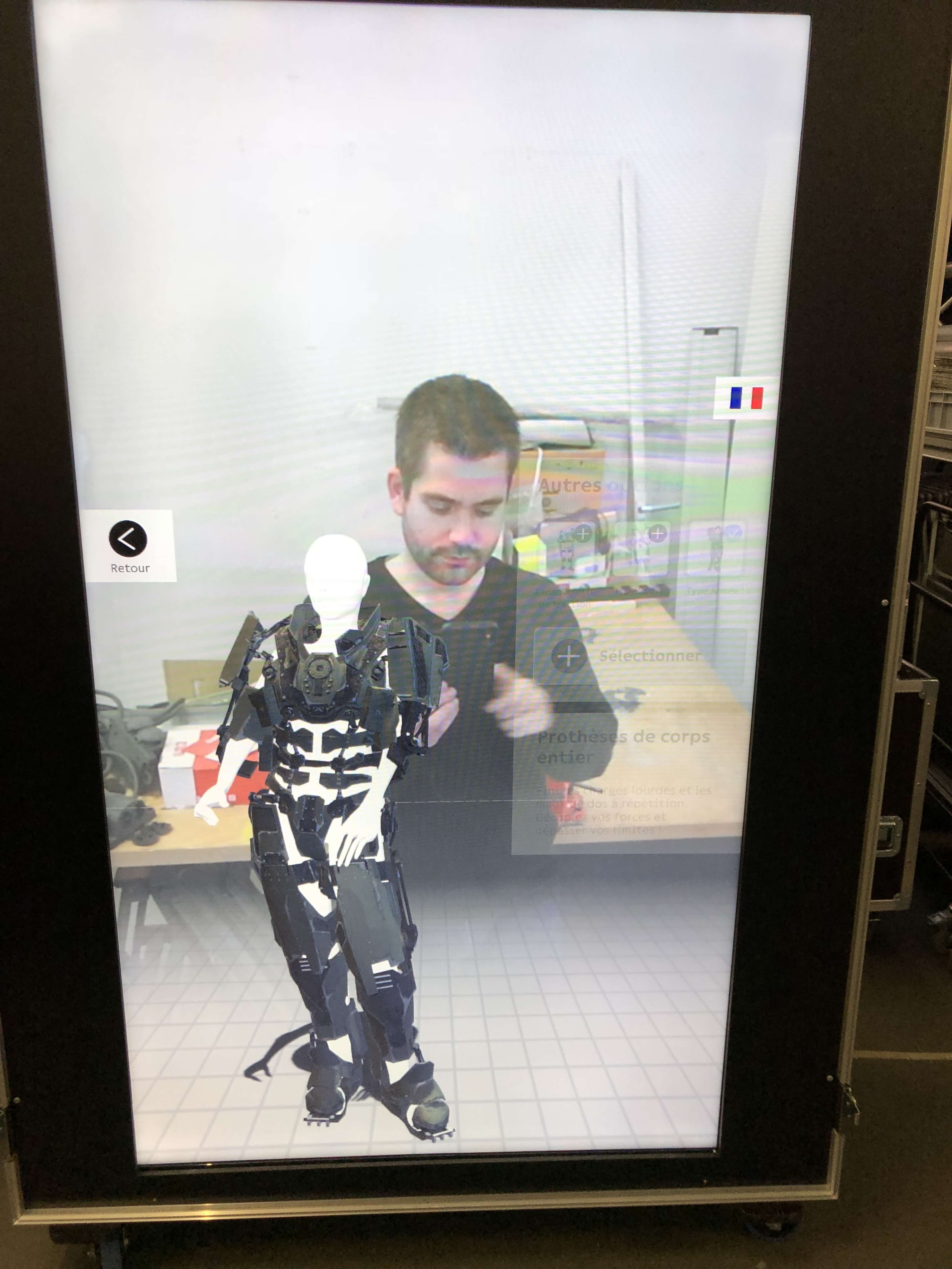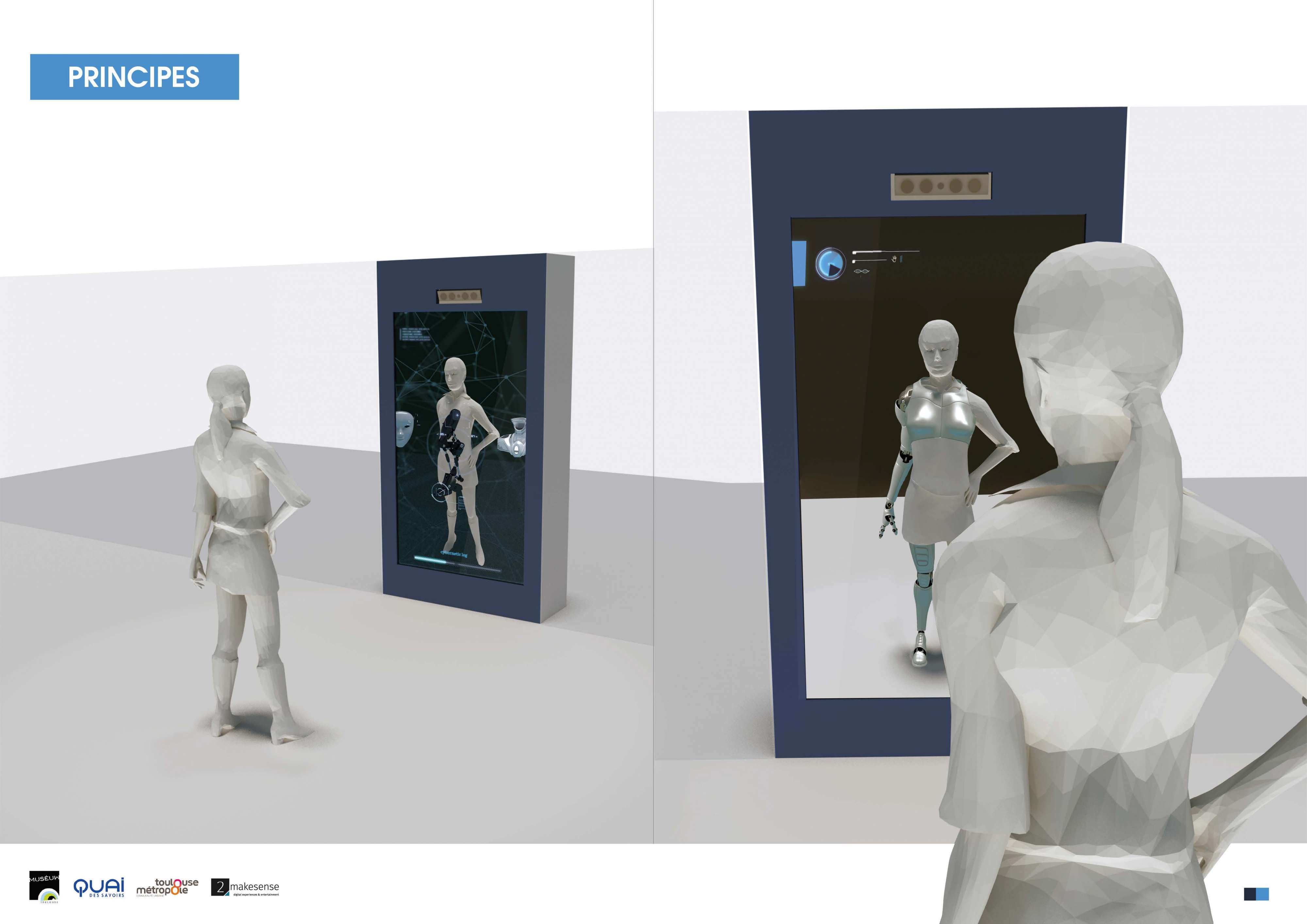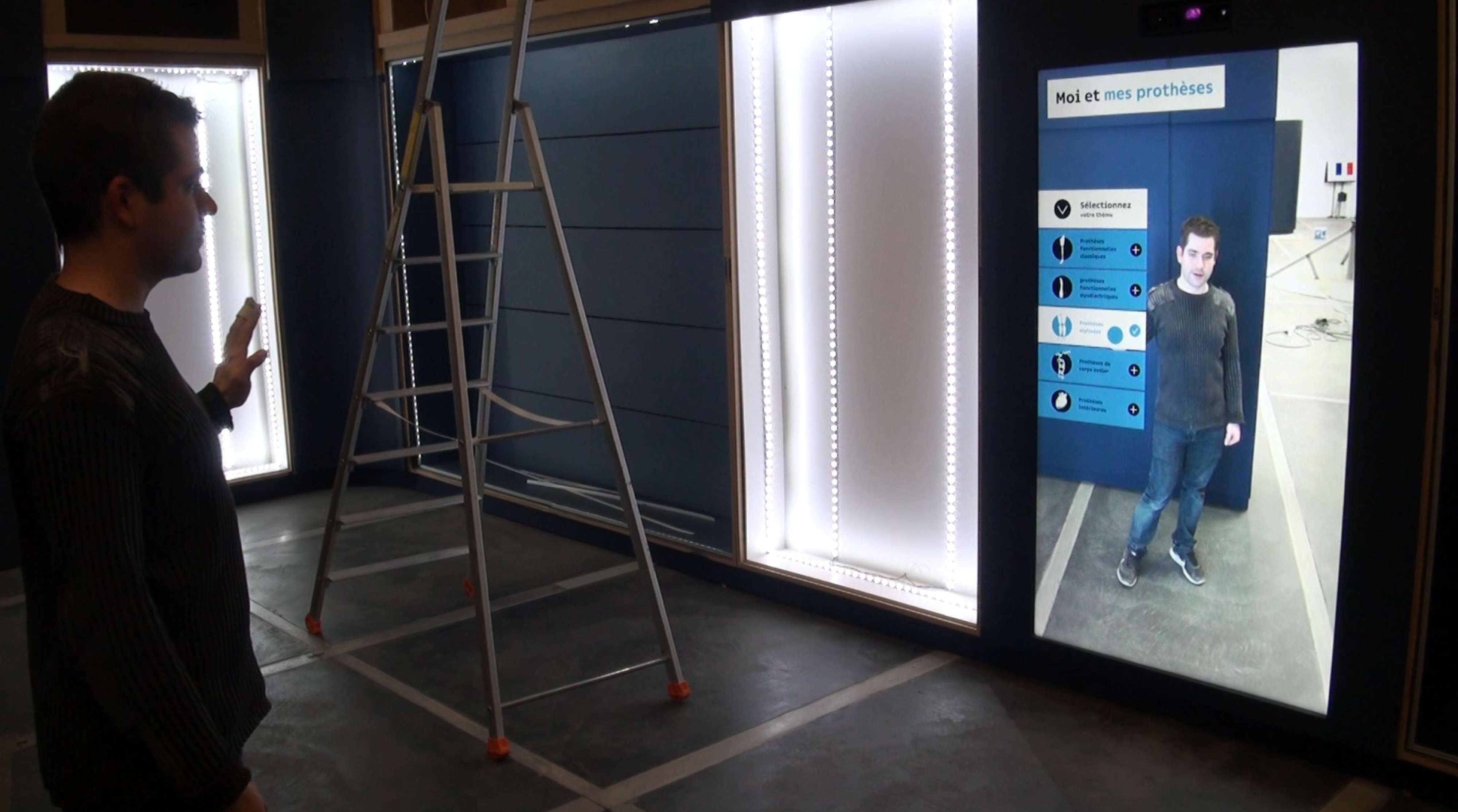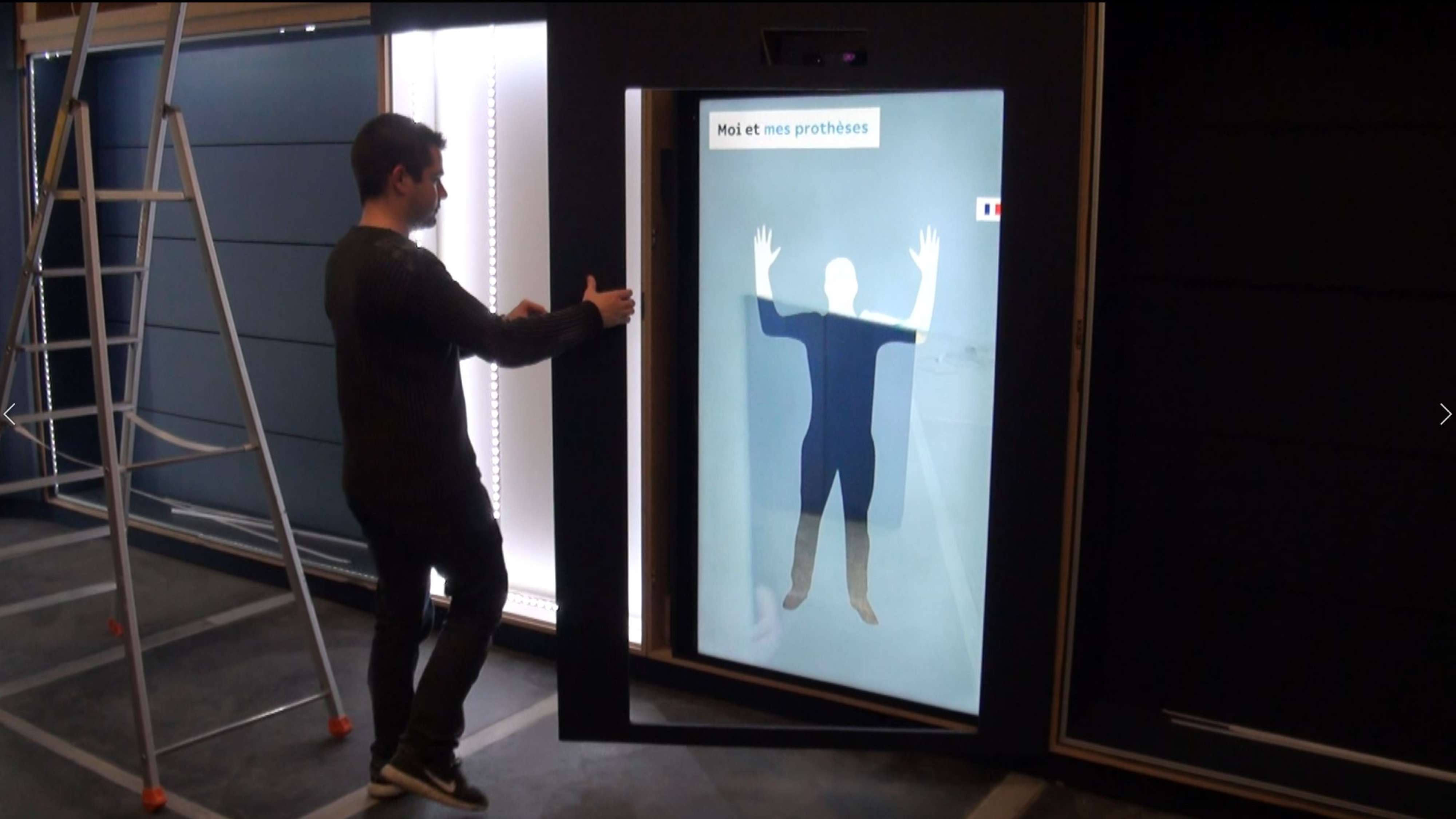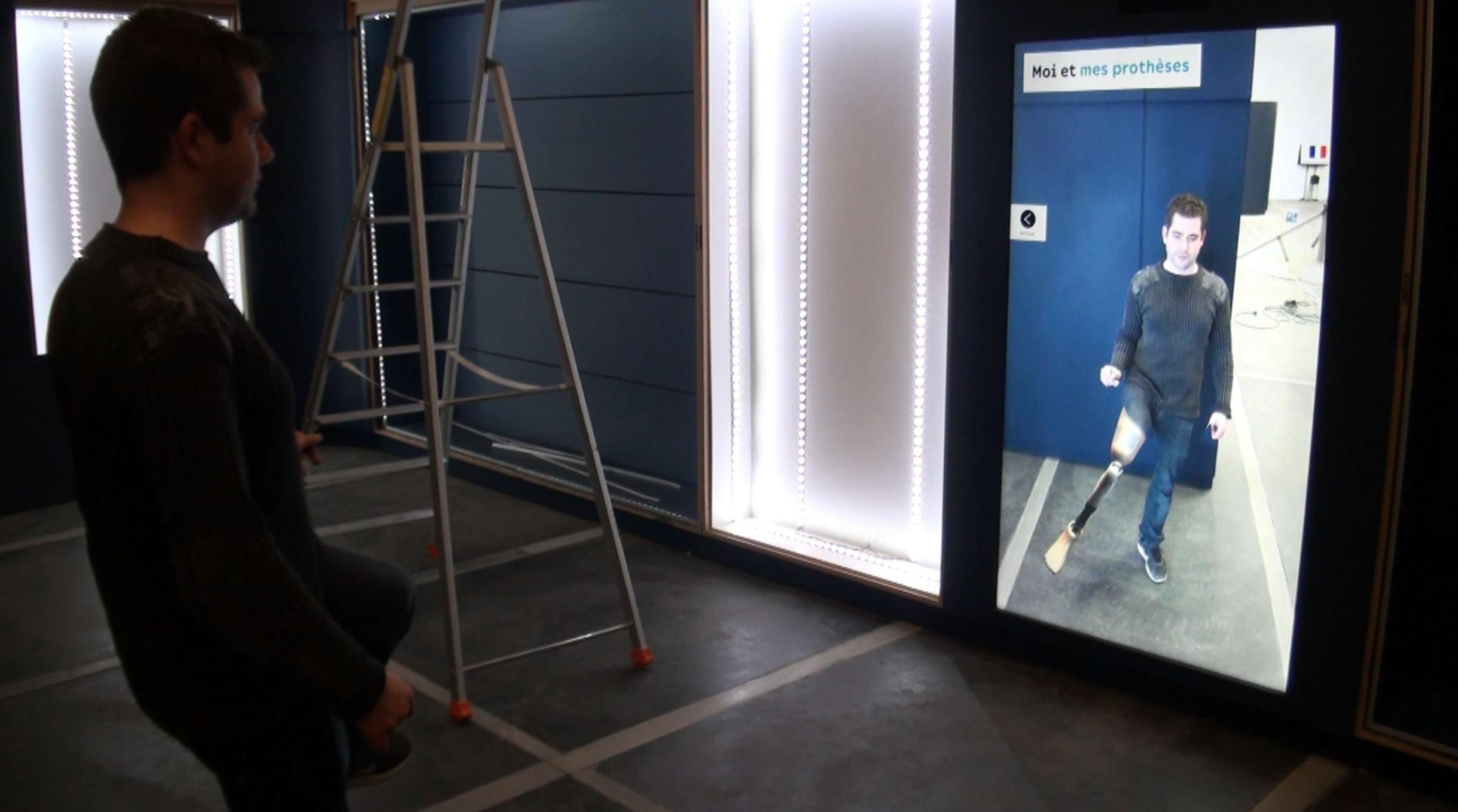 L’œuvre réalisée permet au visiteur de se découvrir avec des prothèses et exosquelettes, en temps réel ! Le rendu est réaliste et présente une technique inédite de d'occlusion/substitution intelligente des membres corporels.
