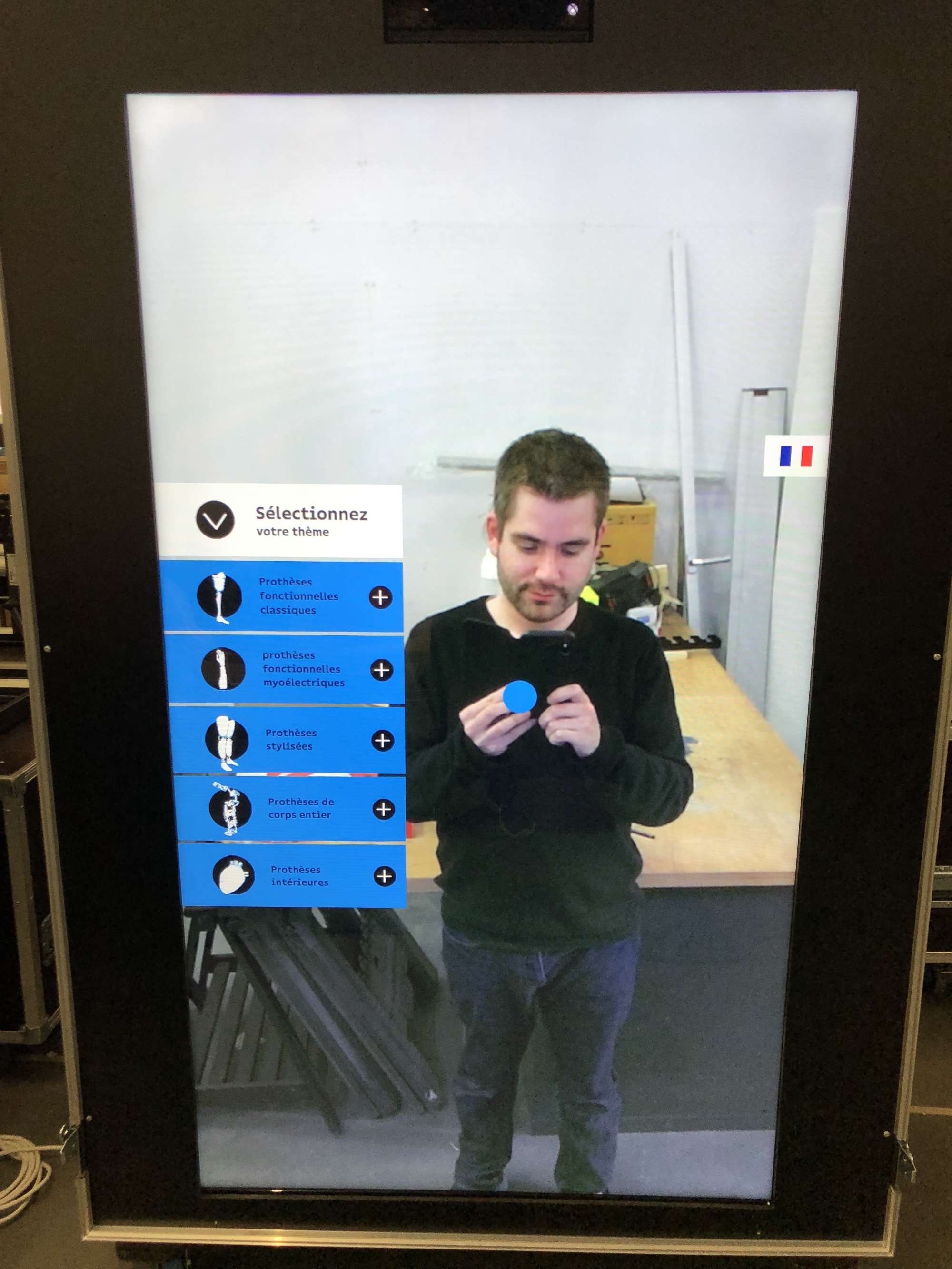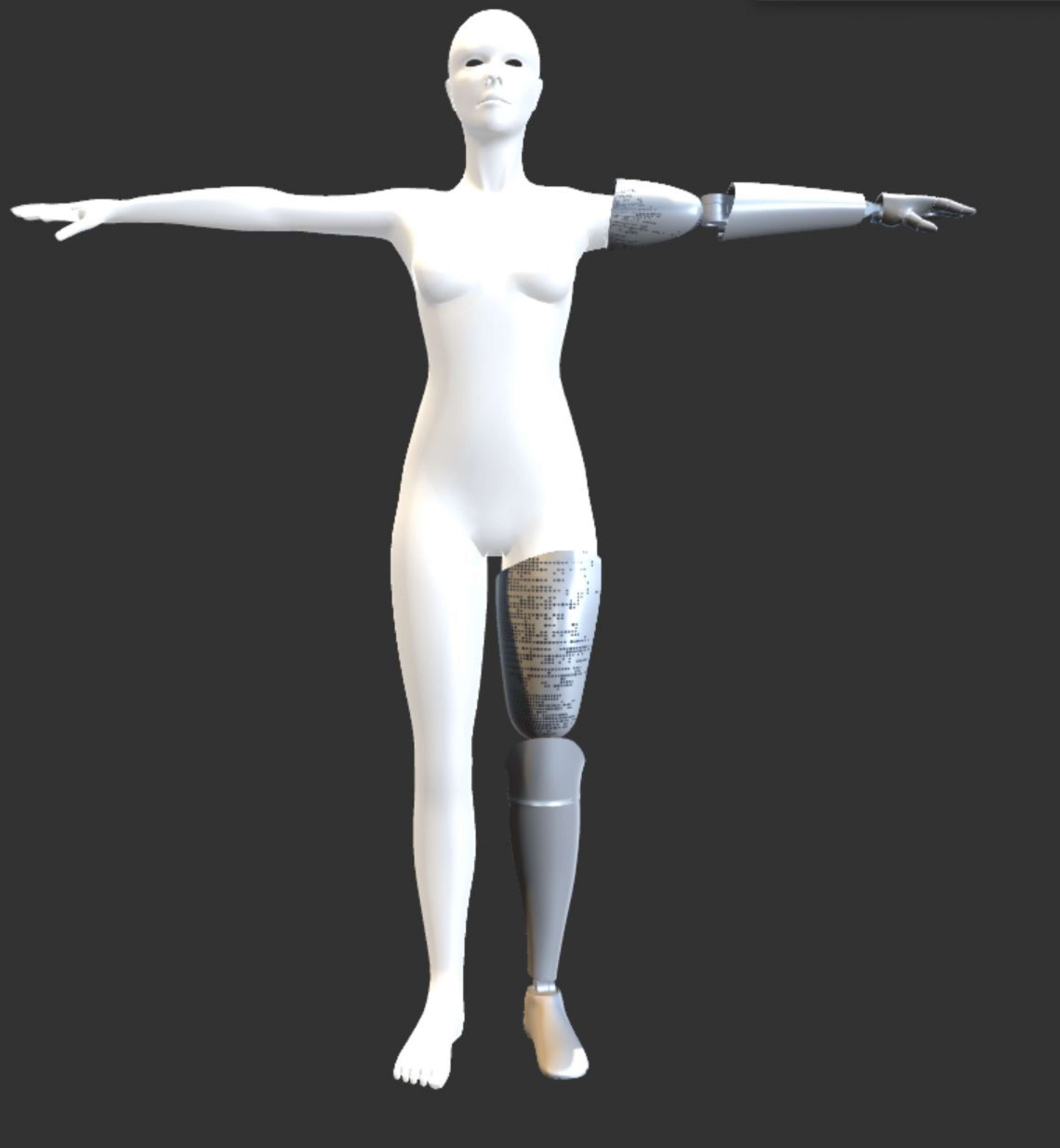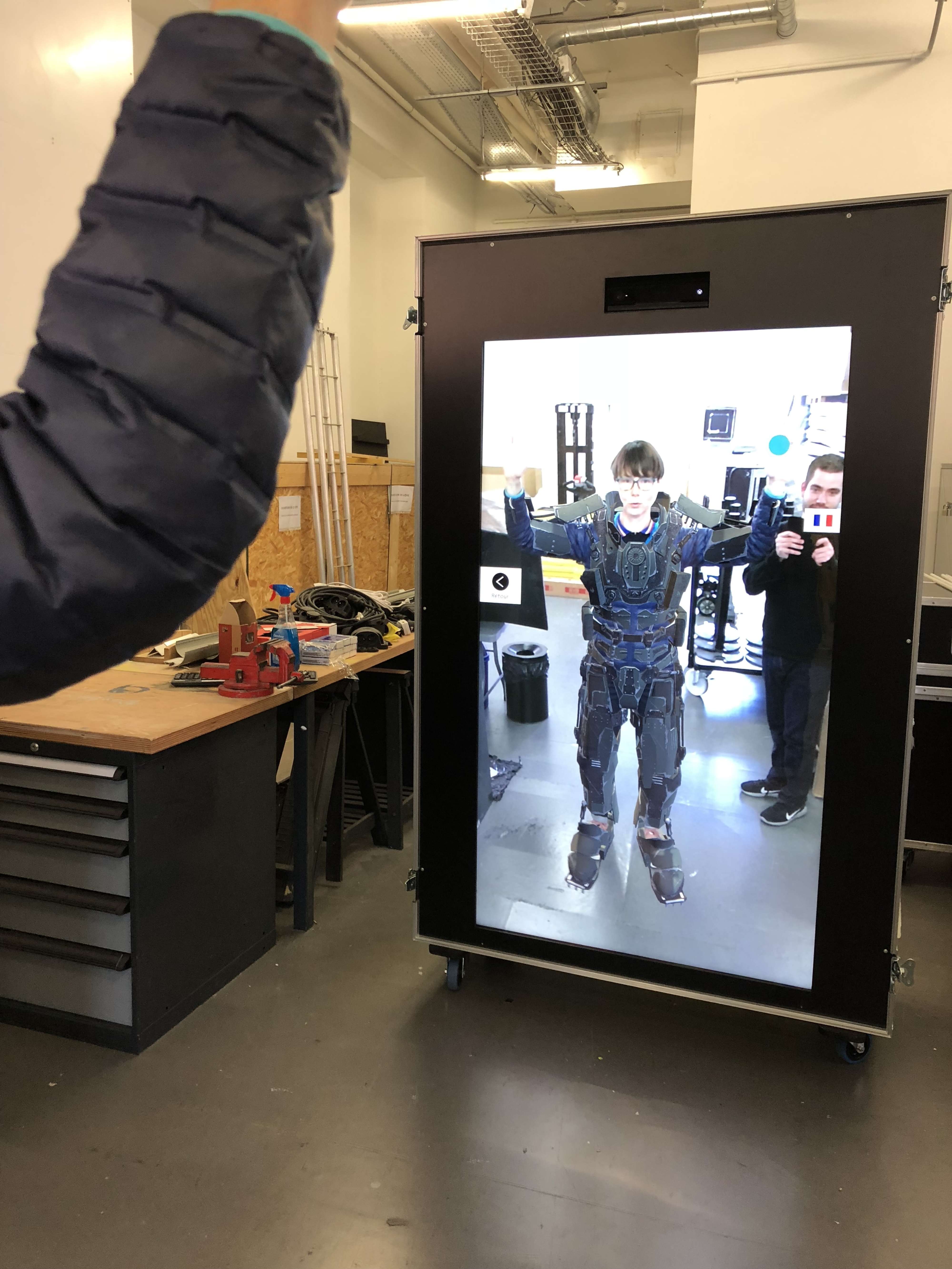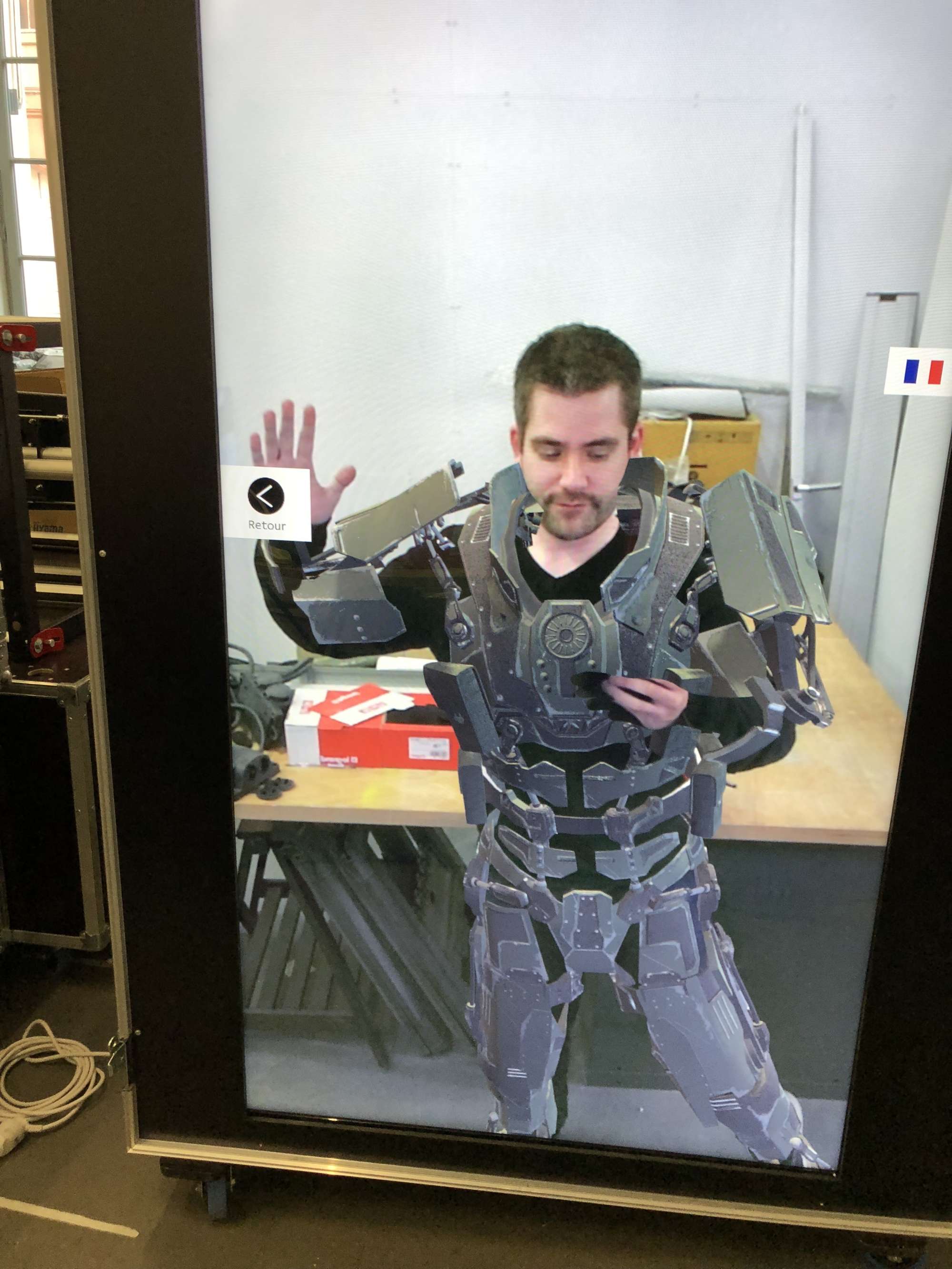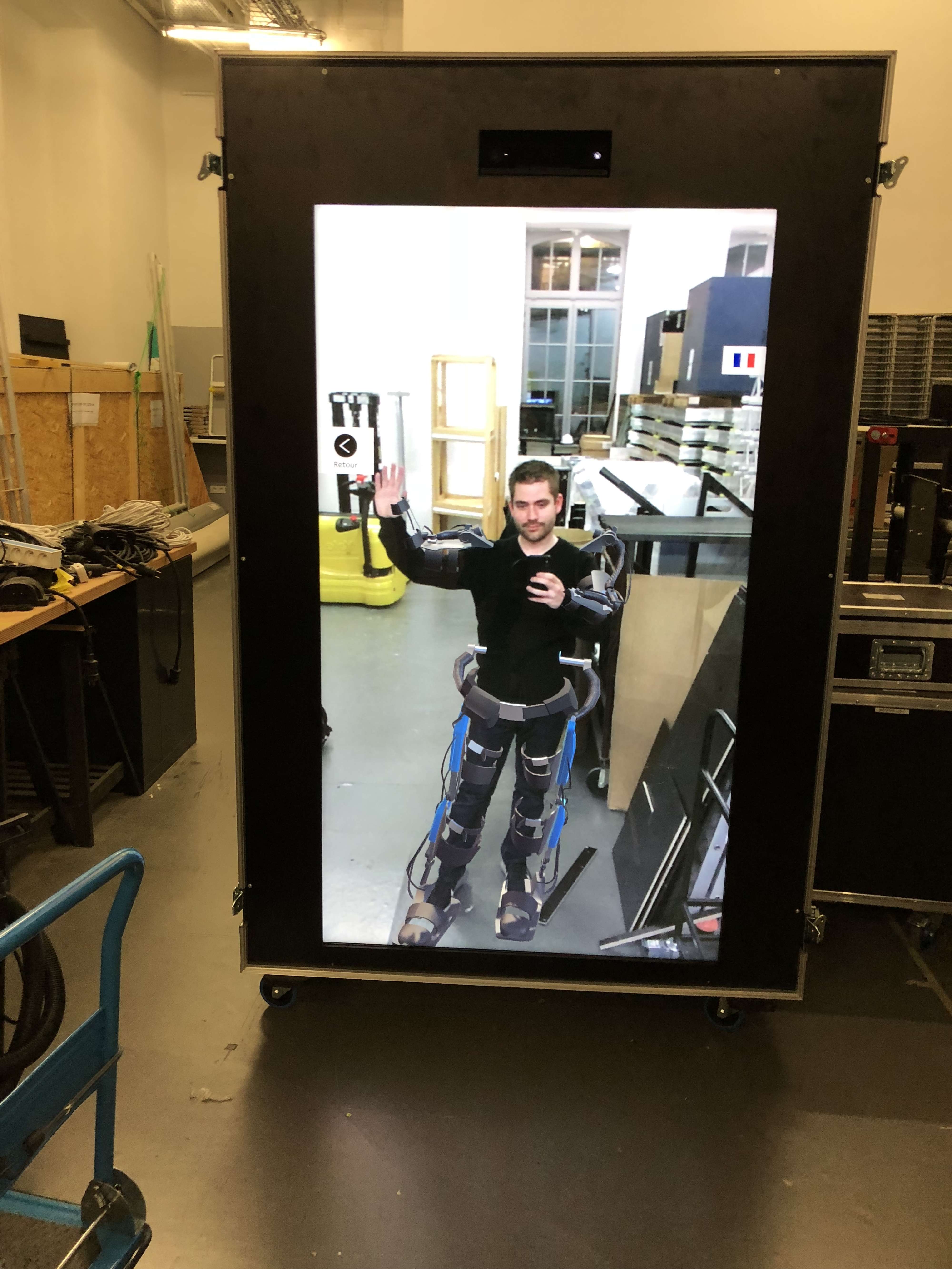 L’œuvre réalisée permet au visiteur de se découvrir avec des prothèses et exosquelettes, en temps réel ! Le rendu est réaliste et présente une technique inédite de d'occlusion/substitution intelligente des membres corporels.