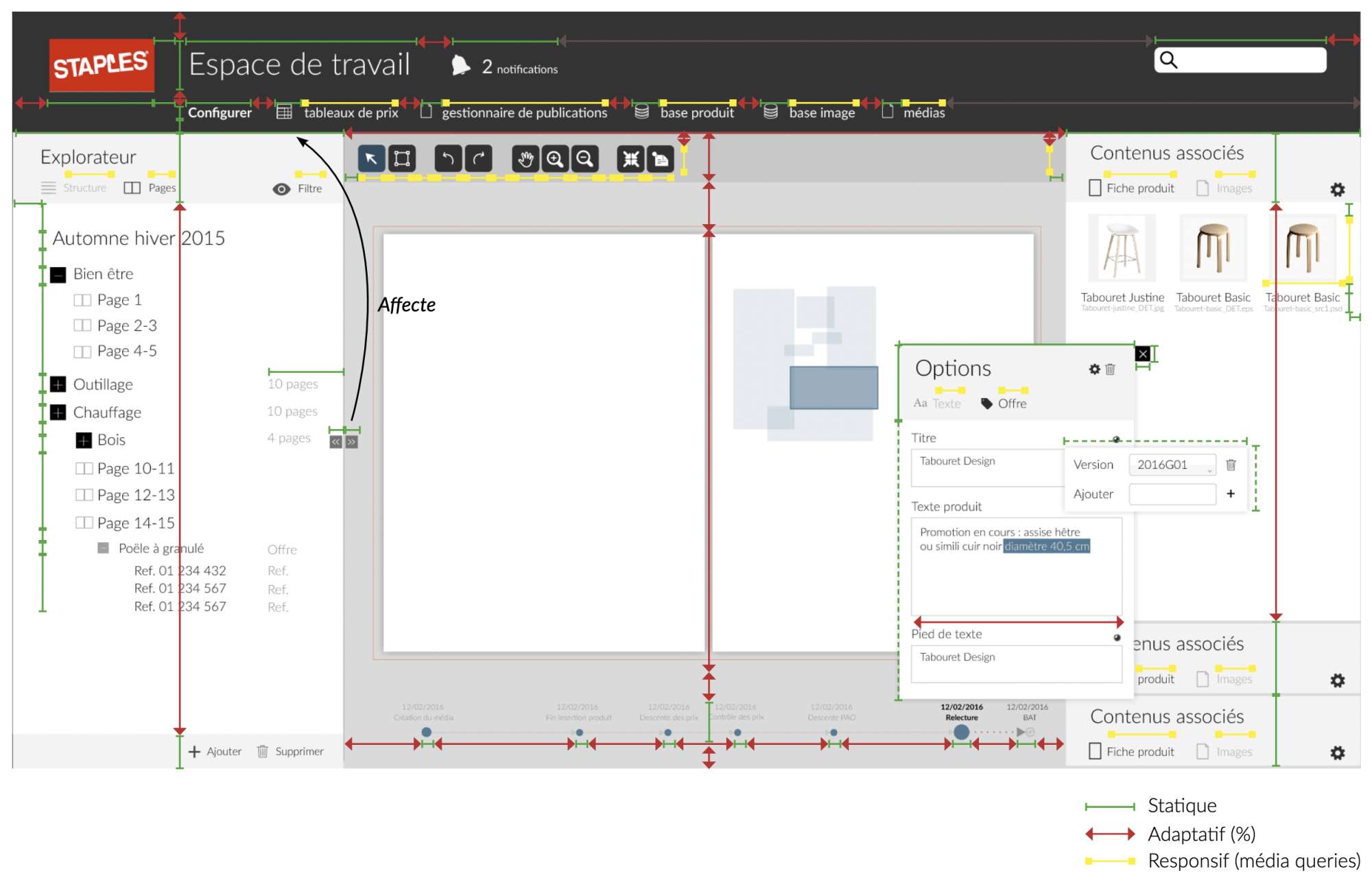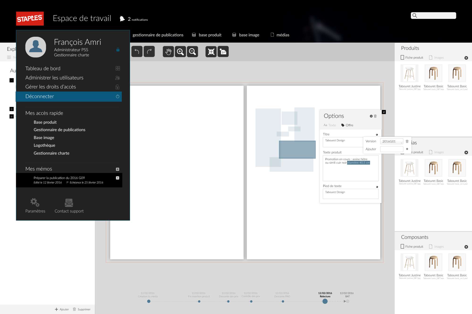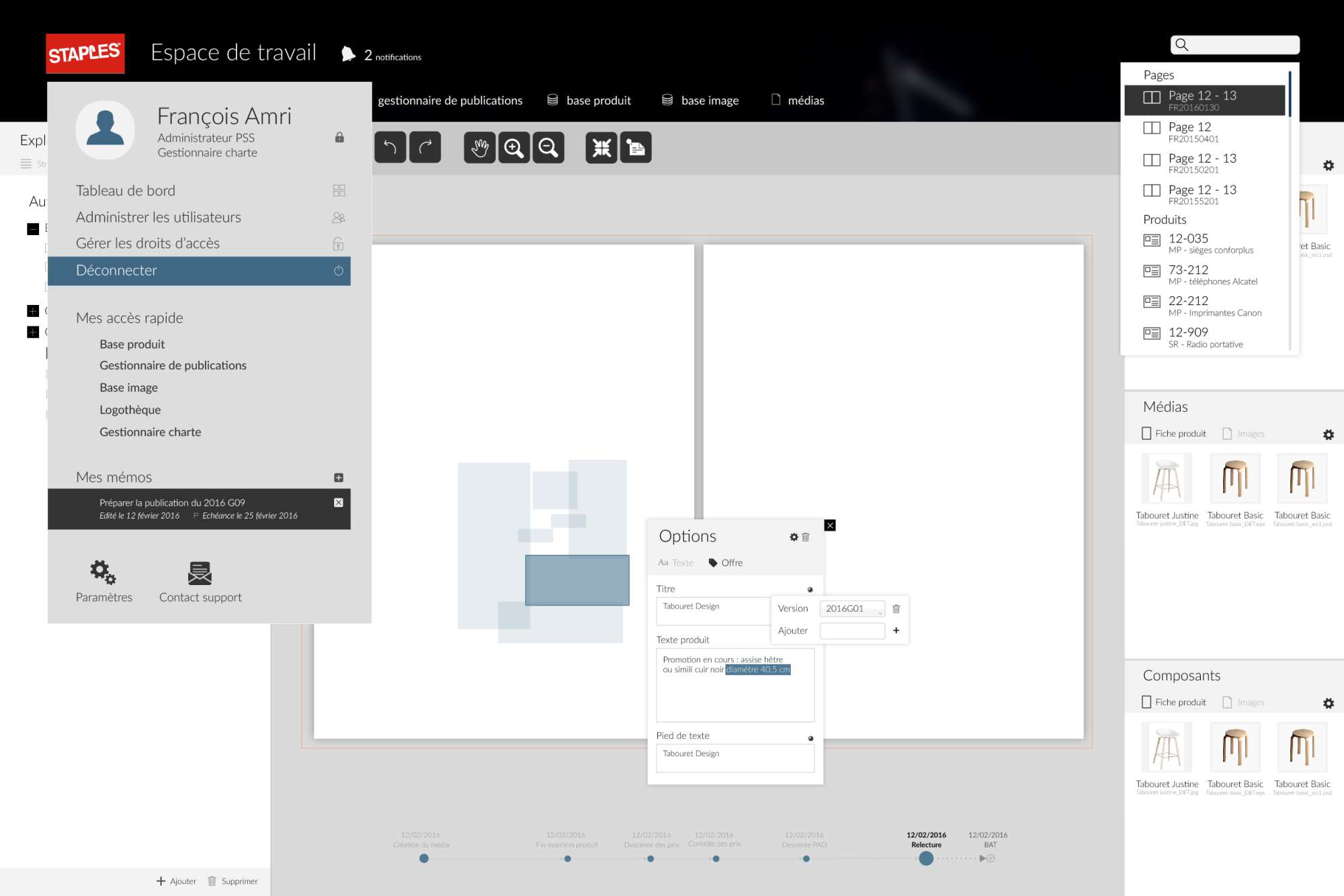 La charte livrée refond l’homogénéité fonctionnelle et implémente à ce titre la gestion/suivir de workflows quantitatifs et les espaces de collaboration. Sans dépendance à un poste, l’utilisateur peut à présent monter directement au sein de l’outil ses assortiments d’offre (en base produit et en page), gérer en interliaison dynamique ses ressources et bases produit, précomposer, animer des campagnes, accéder aux médias et leurs reconductions, ainsi que suivre les avancées productives.