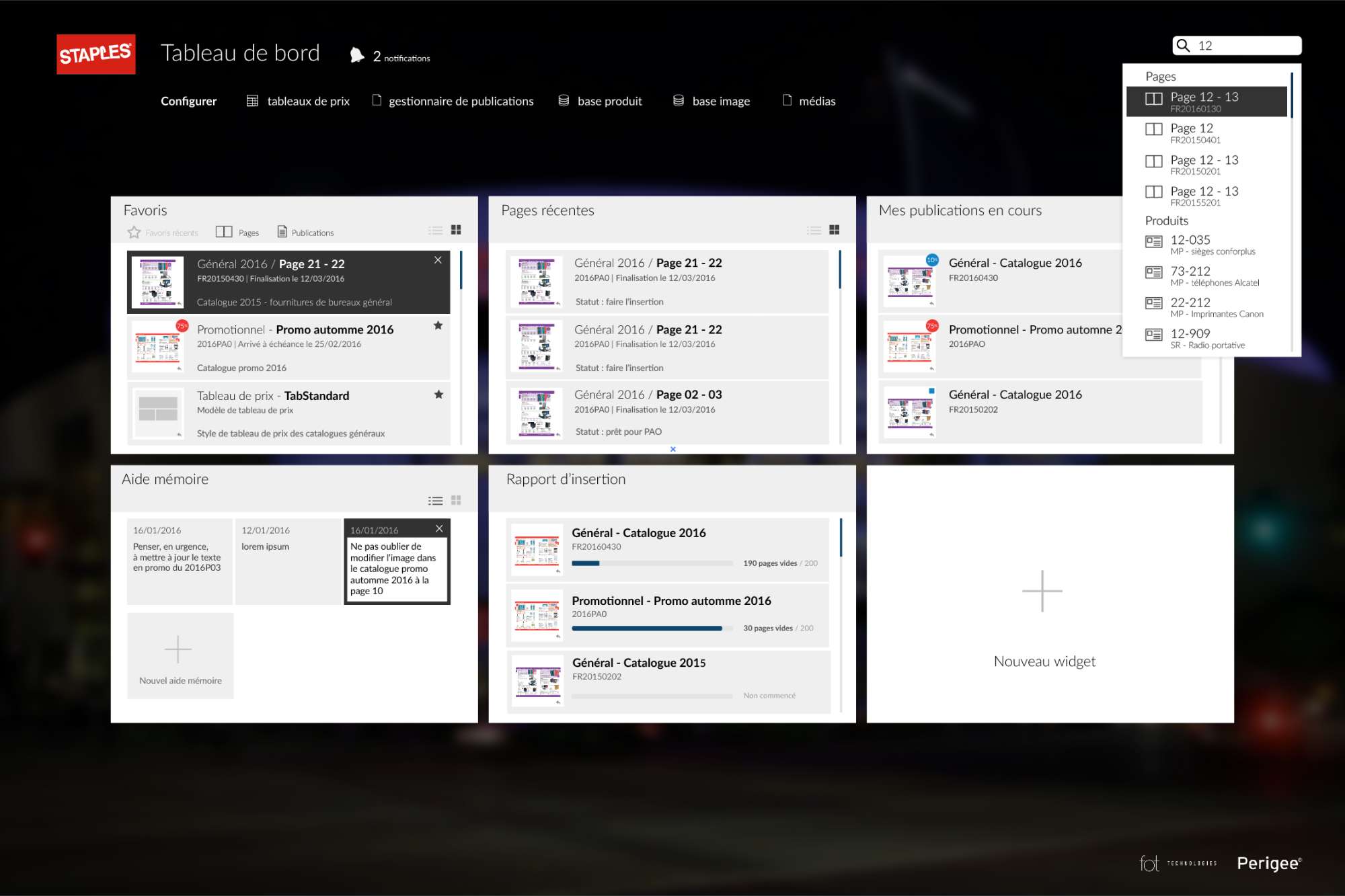 Bénéficiant déjà d'une expérience des bénéfices et contraintes de la solution Perigee en production multicanale et collaborant avec FOT dans la réflexion préalable et l'identité générale, j'ai pu apporter une transcription identitaire transversale de l’outil, en expérience et interopérabilité des fondamentaux, permettant dans un contexte d'exploitation web d’accroitre les champs d’action et d’édition de la solution logicielle.